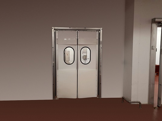 - Маятниковые двери из ПНД предназначены для помещений с самыми жесткими требованиями к гигиене, а также для дверных проемов с большим потоком проходящих людей.
